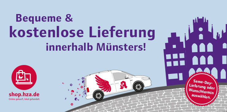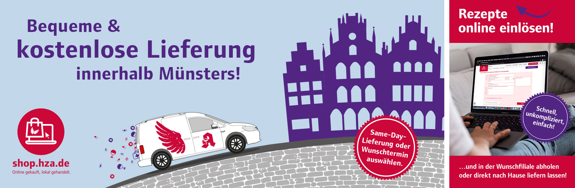 Medikamente online bestellen und deutschlandweit per Postversand liefern lassen – Innerhalb von Münster über den Lieferservice unserer Apotheke sogar am gleichen Tag oder als Termin-Lieferung.