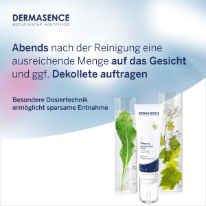 Anwendung: Abends nach der Reinigung mit DERMASENCE Mousse Reinigungsschaum und DERMASENCE Tonic eine ausreichende Menge auf das Gesicht und bei Bedarf auf das Dekolleté auftragen. Die besondere Dosiertechnik ermöglicht eine sparsame Entnahme des hochwertigen Serums.