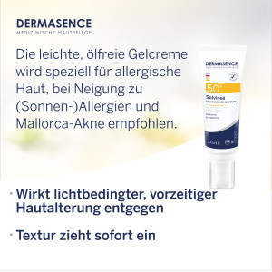 Die DERMASENCE Solvinea Sonnenschutz-Gelcreme LSF 50+ mit sehr hohem UV-Schutz ist leicht und ölfrei und dadurch ideal geeignet für empfindliche, zu (Sonnen-)Allergien und Mallorca-Akne neigende Haut. Sie schützt vor lichtbedingter, vorzeitiger Hautalterung, zieht schnell ein und ist auch für zarte Kinderhaut geeignet. Ohne Emulgatoren, Konservierungsstoffe und PEGs. Dermatologisch getestet, parfümfrei und vegan.
